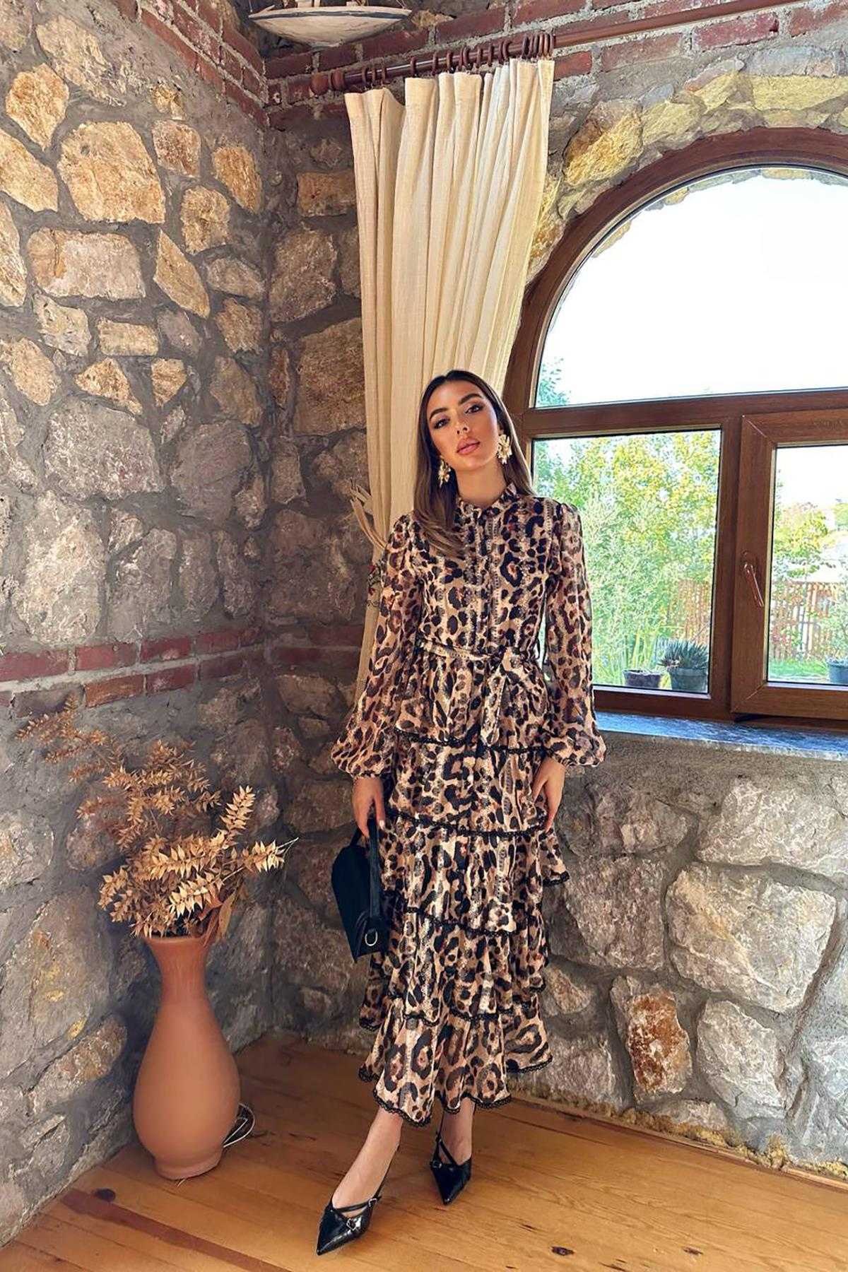 Toptan Leopar Volanlı Şeritli Uzun Elbise