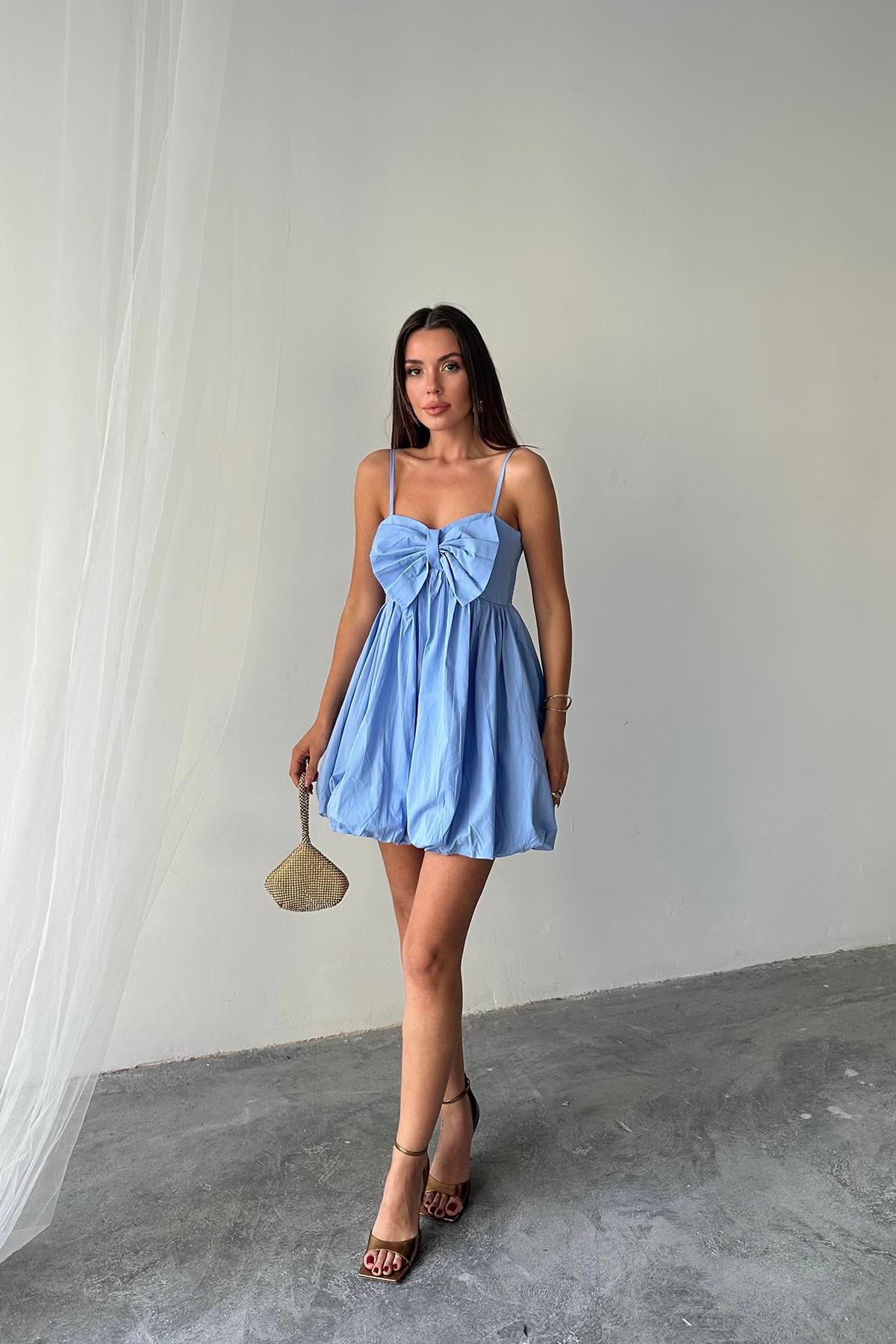 Toptan Mavi Önü Fiyonklu Askılı Elbise