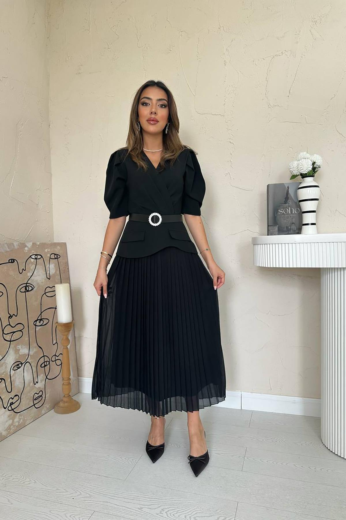 Wholesale Black Double-Breasted Pleated Dress (8990)