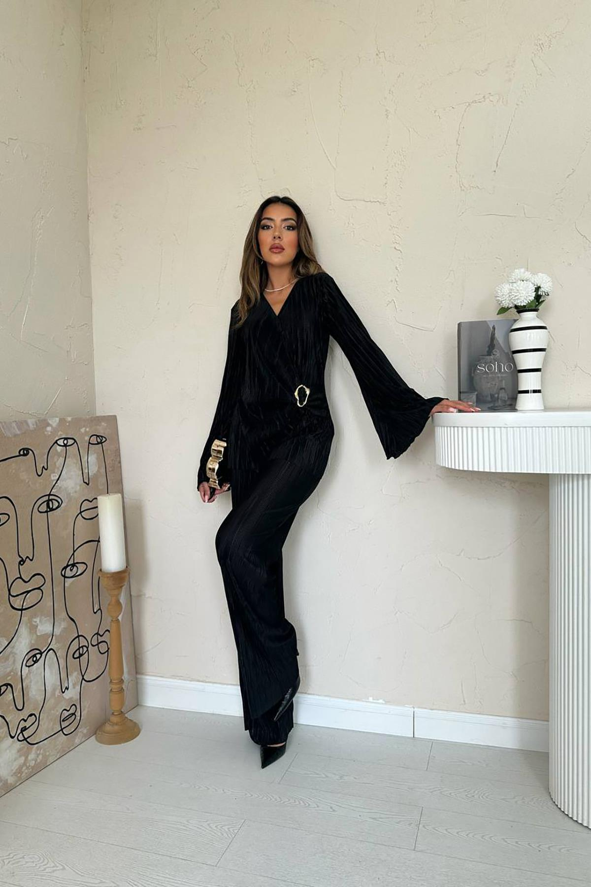 Wholesale Black Pleated Suit with Buckle Detail (9181)