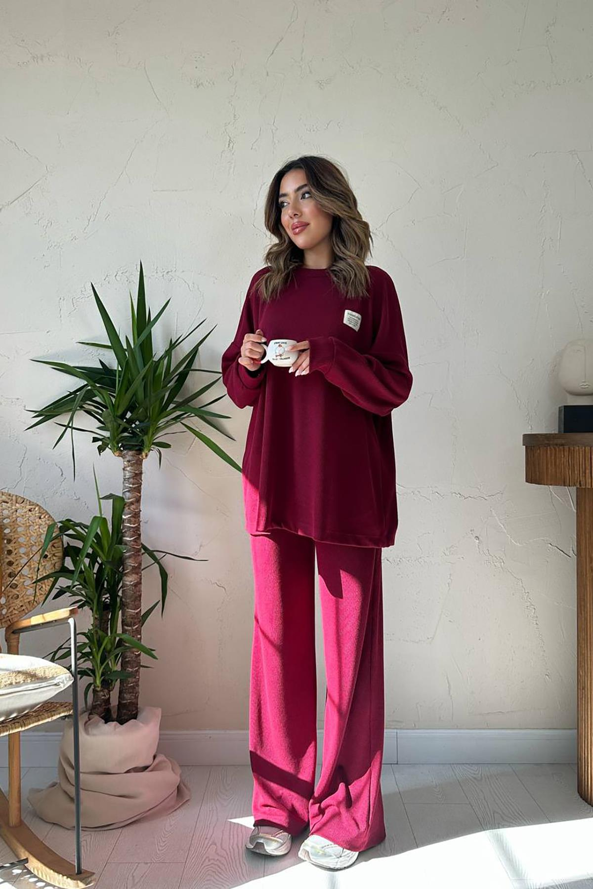Toptan Bordo Klasik Fitilli Kazak ve Pantolon Takım