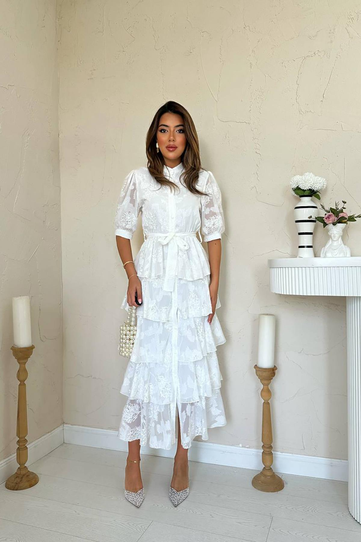 Toptan Ekru Kat Kat Desenli Elbise