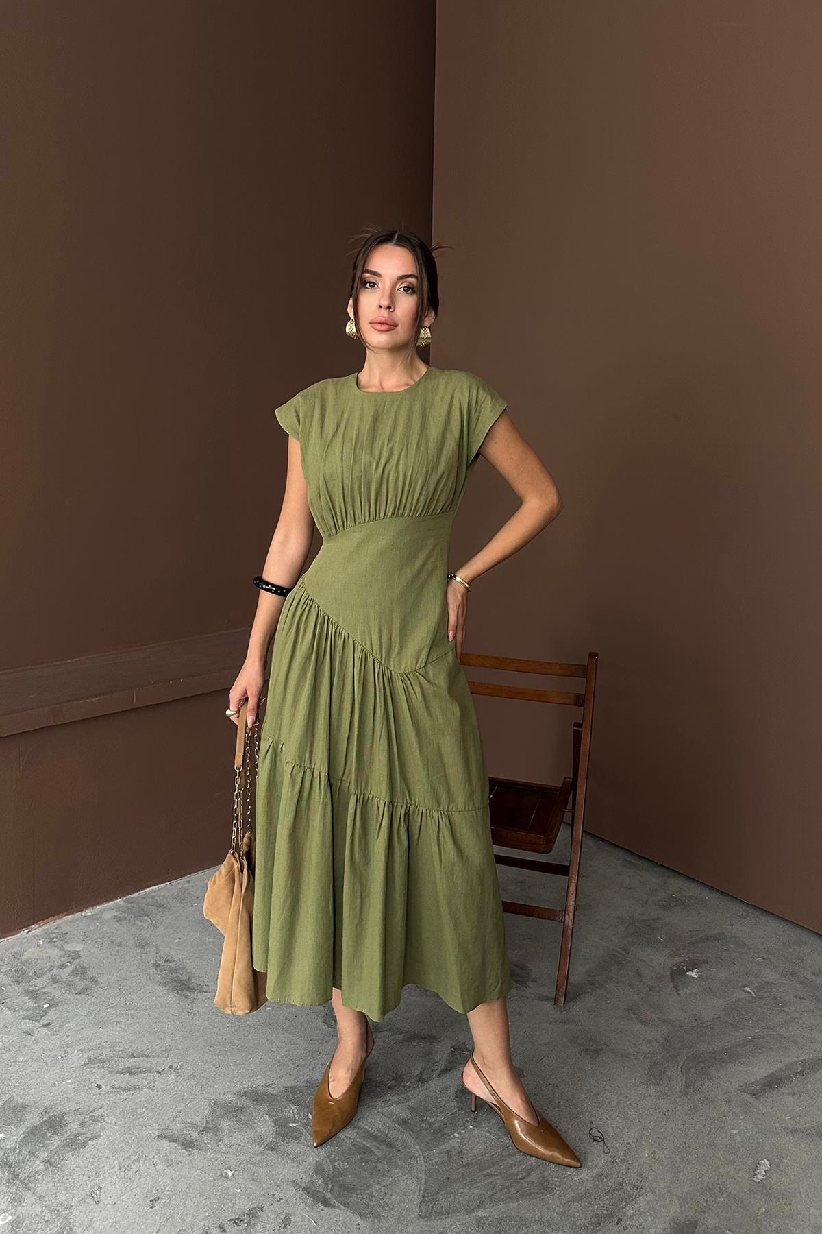 Toptan Haki Büzgü Detaylı Keten Elbise