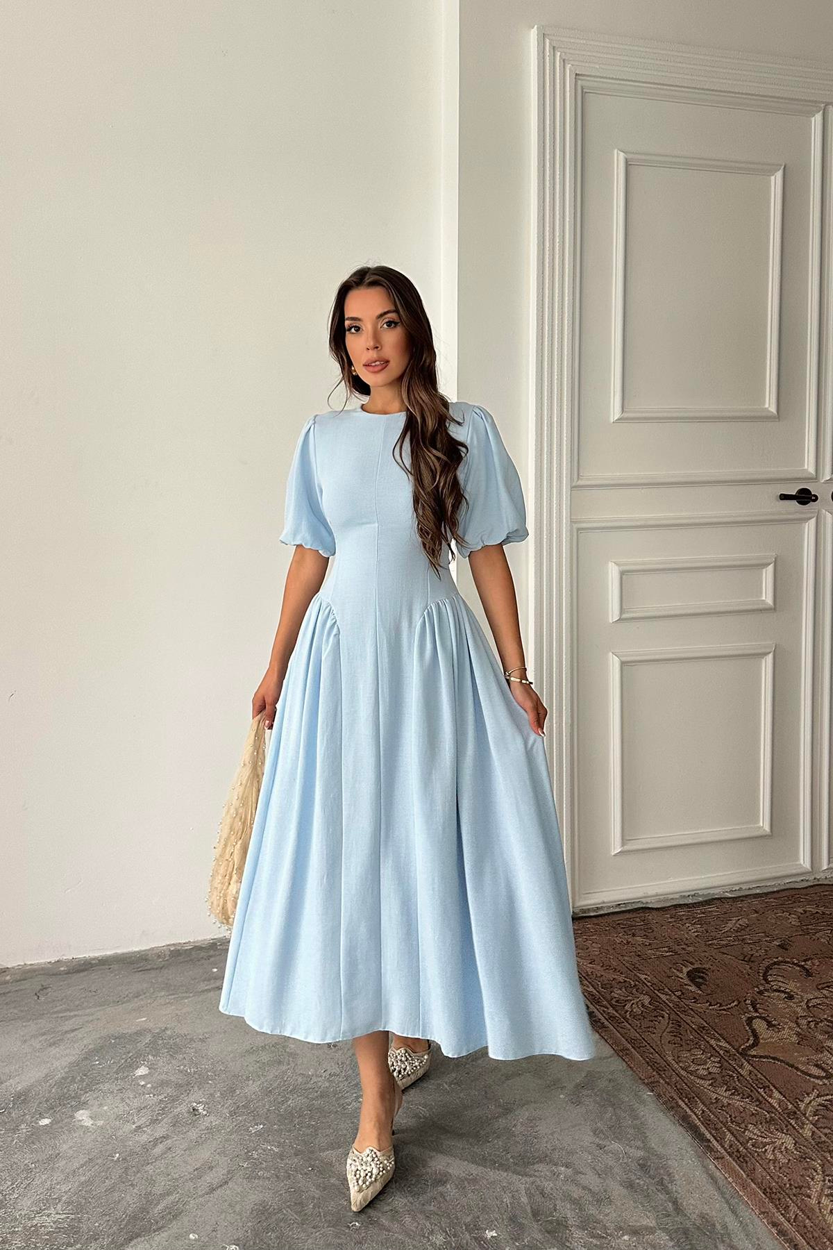 Toptan Mavi Arkadan Bağlamalı Büzgülü Keten Elbise