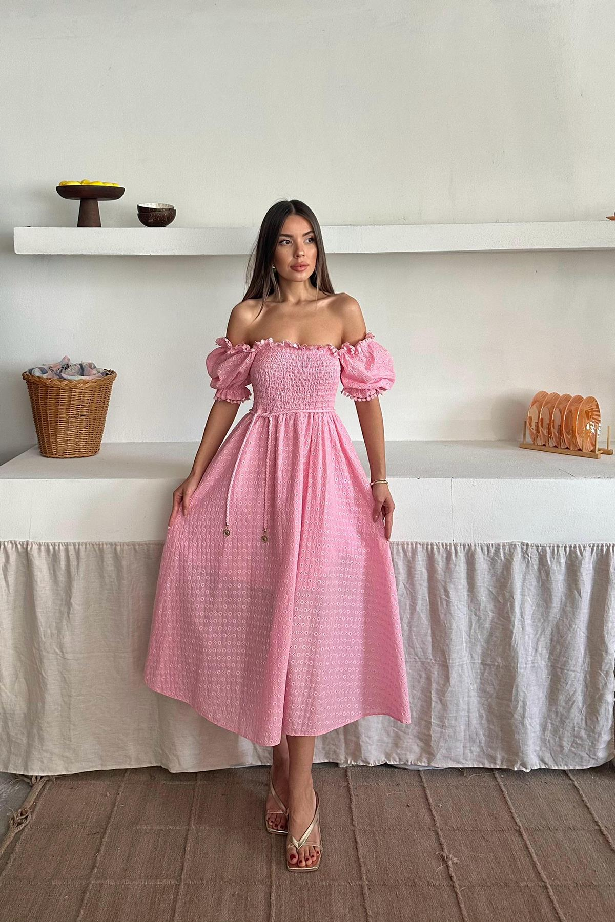 Toptan Pembe Gipeli Brode Elbise