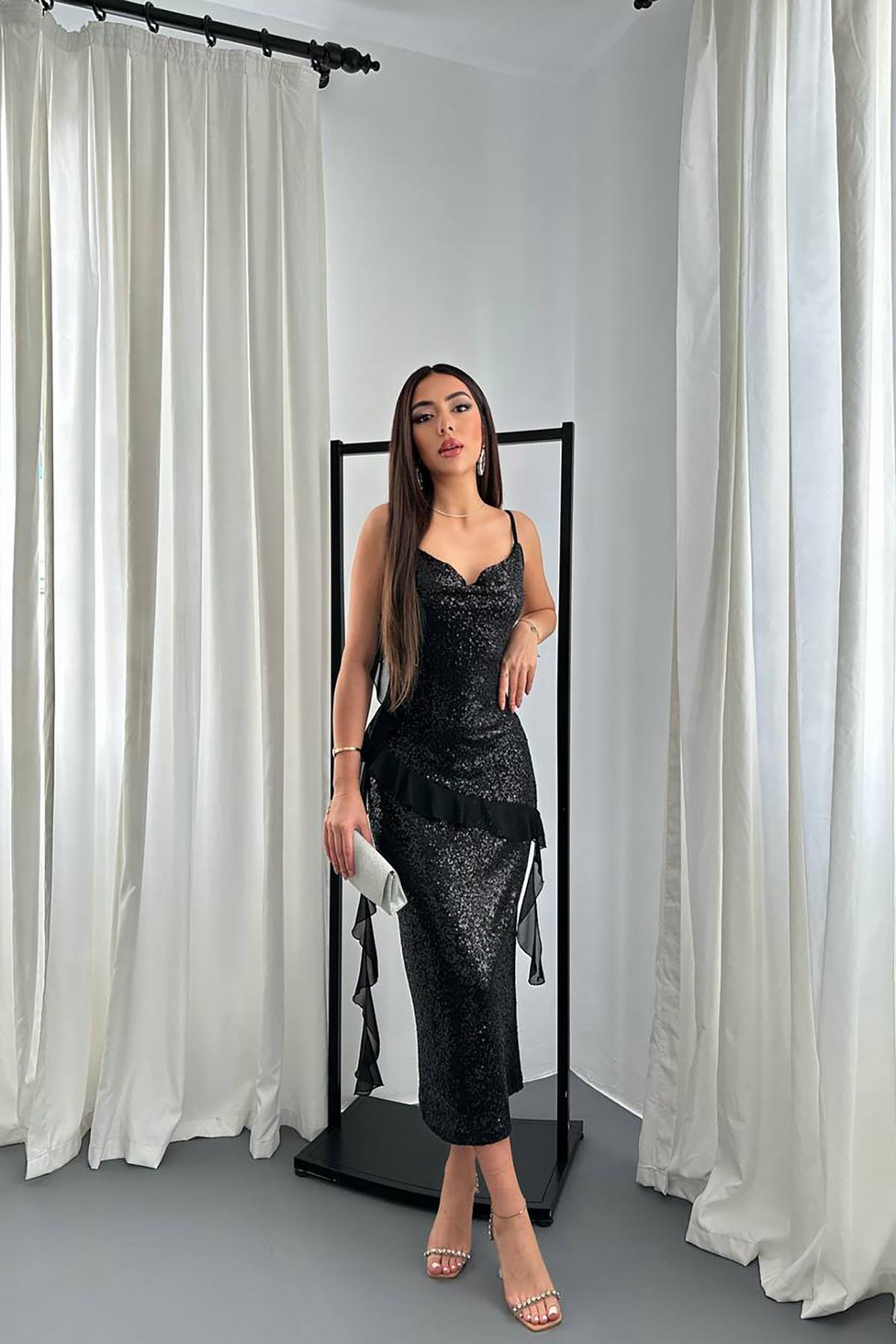 Toptan Siyah Pul Payetli Şifon Fırfırlı Elbise