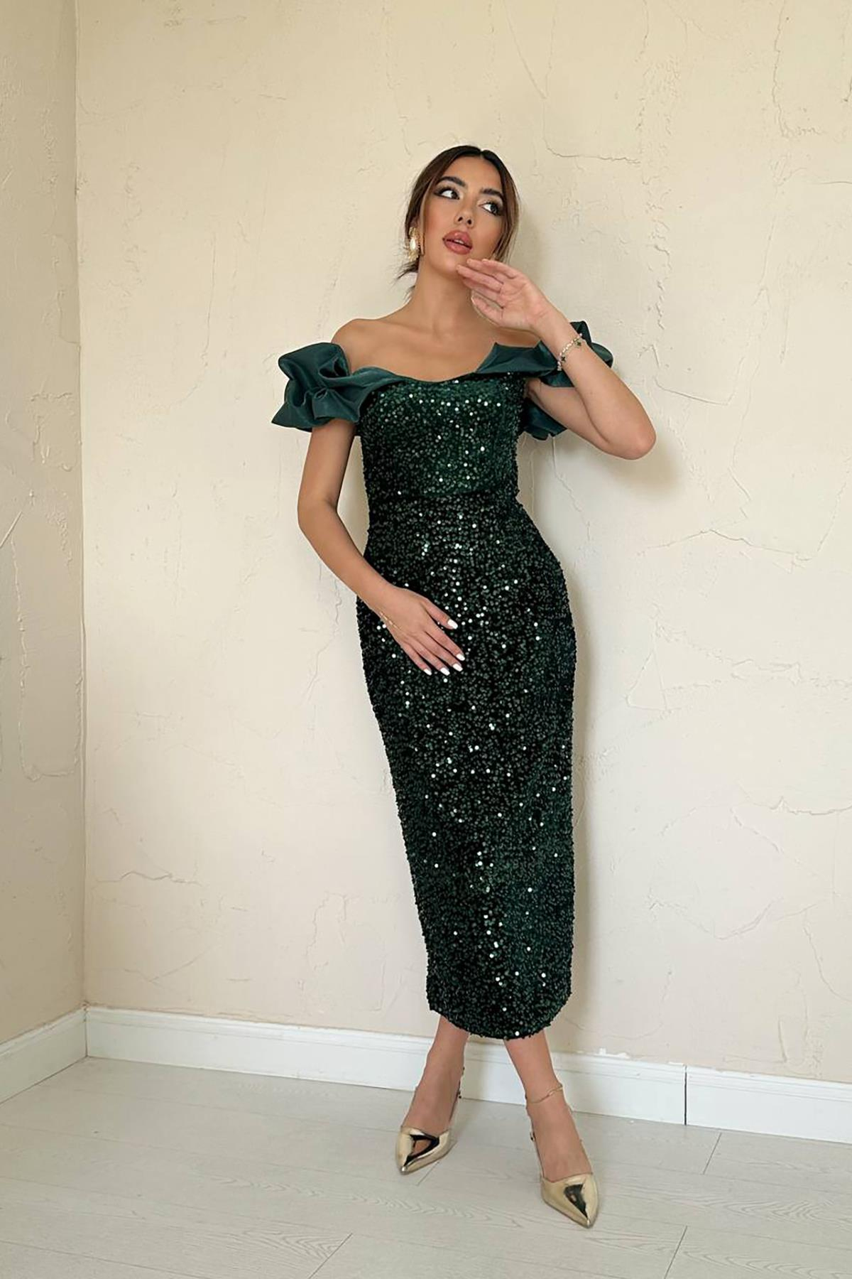Toptan Zümrüt Pulpayetli Kolsuz Elbise