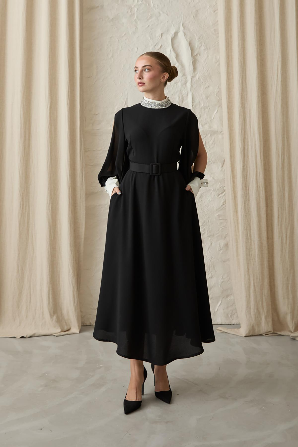 Оптовая продажа черного воротника и рукава каменное платье (8186)