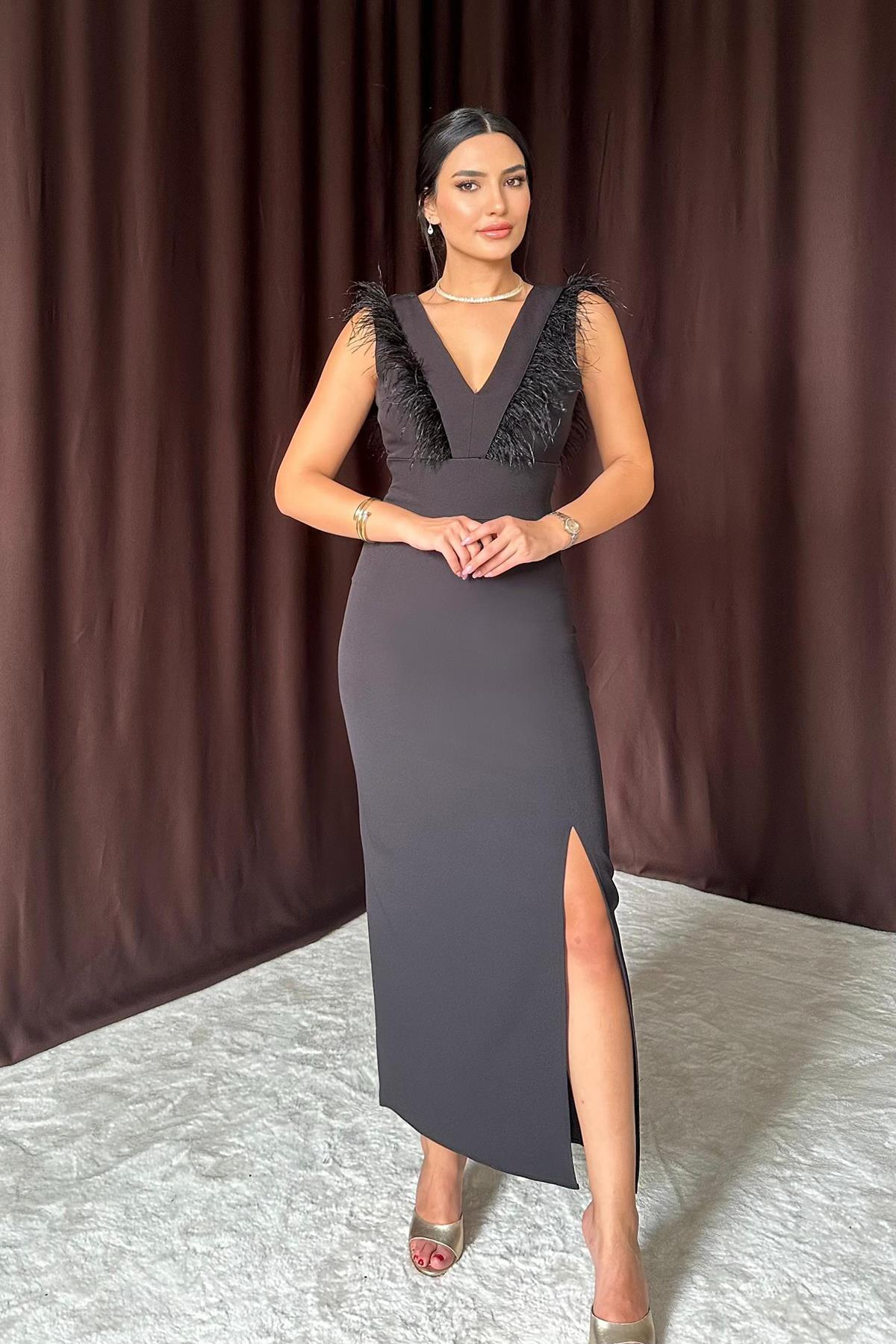 Оптовое красное платье с перьями и разрезом Оптовое черное платье с перьями и разрезом