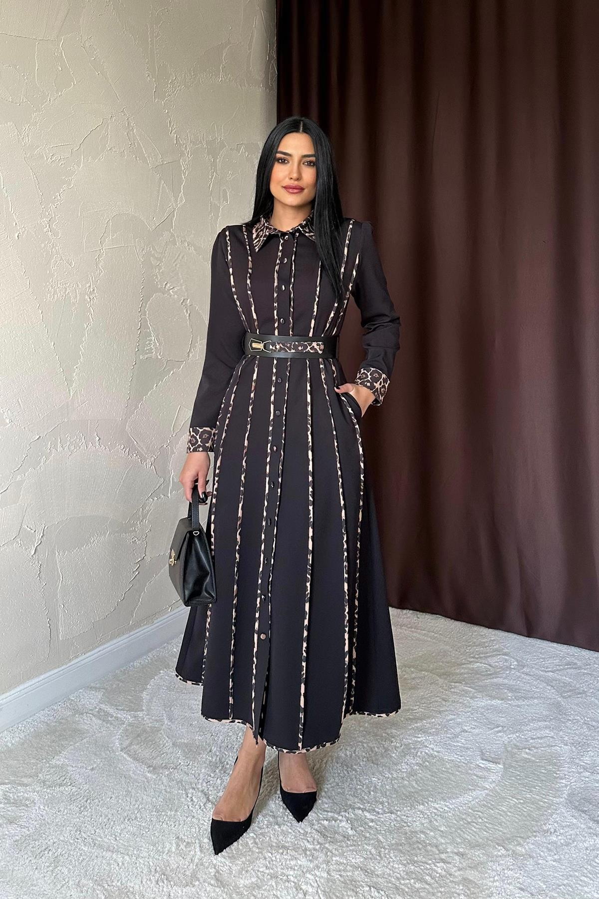 Оптовое черное платье с леопардовым принтом и поясом (8460)