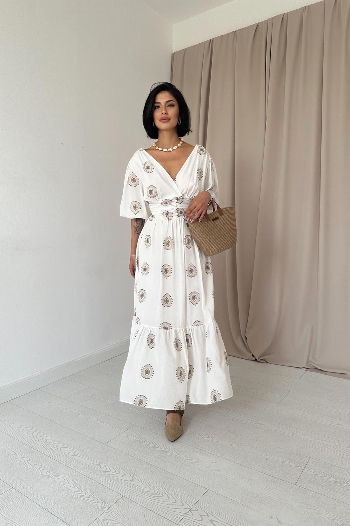 Оптовое коричневое платье с рукавами-фонариками и корсажем