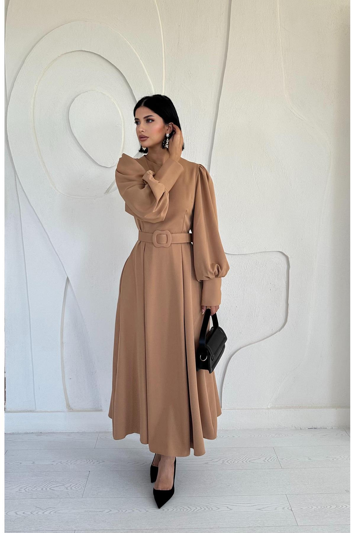 Оптовая продажа верблюжьего цвета с рукавами-фонариками и поясом (8193)