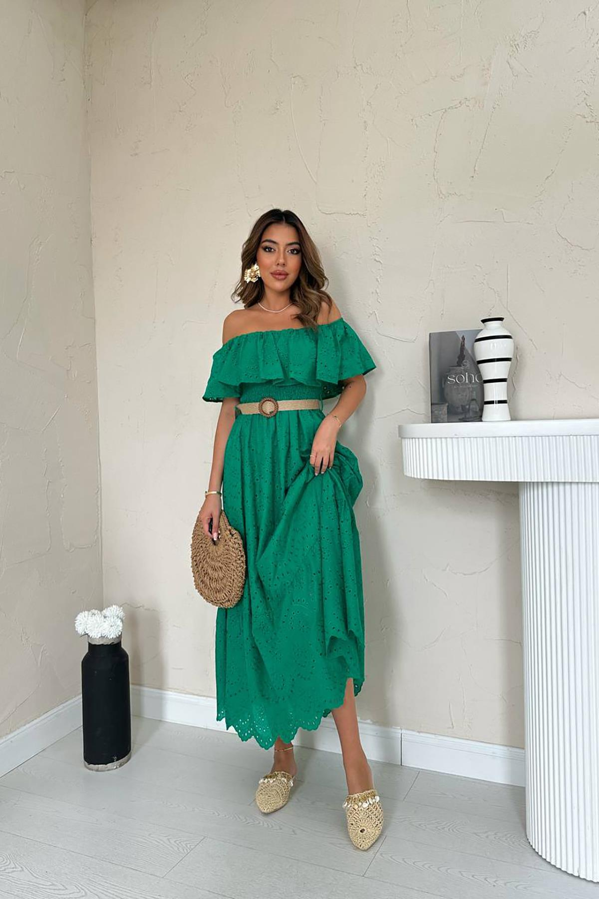 Оптовая продажа зеленое эластичное плечевое вышитое платье