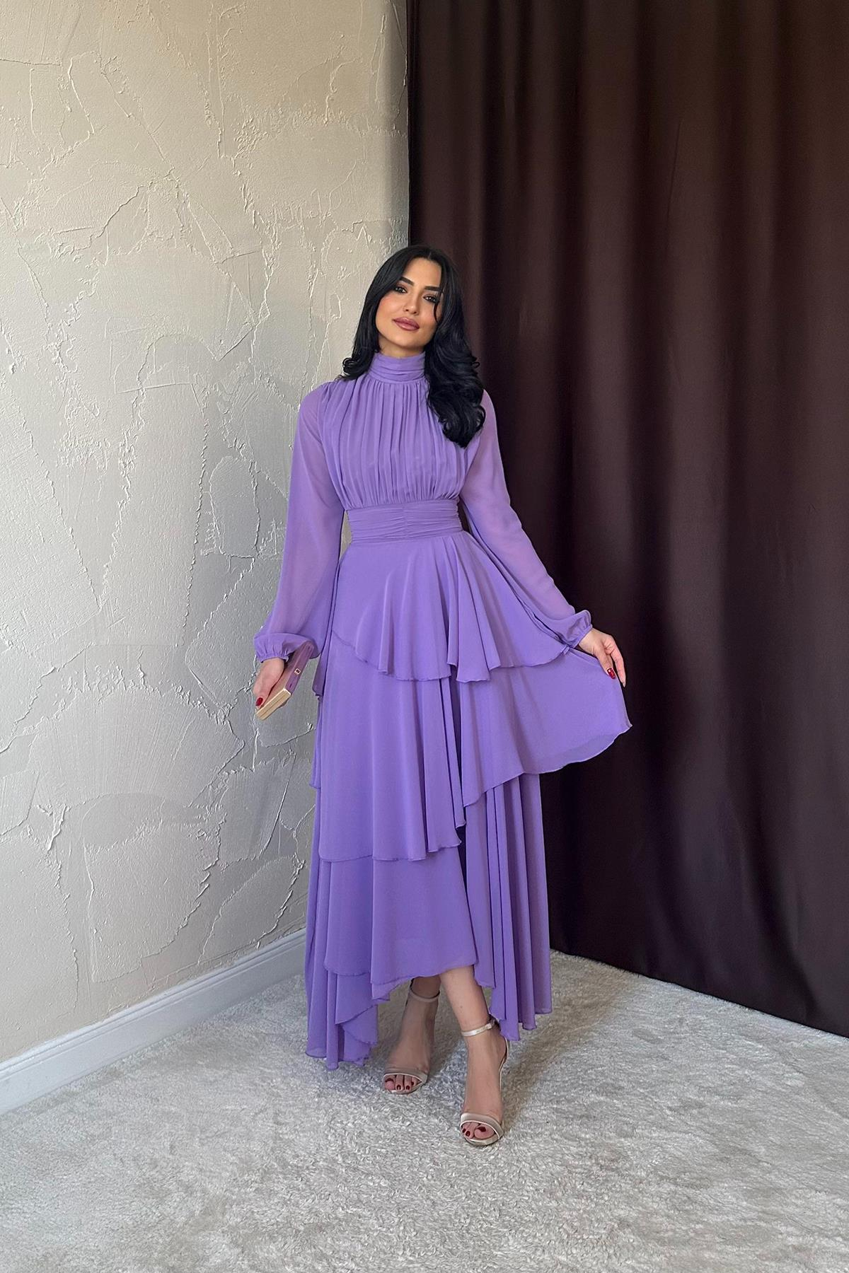 Оптовая продажа сиреневого платья с отделкой талии