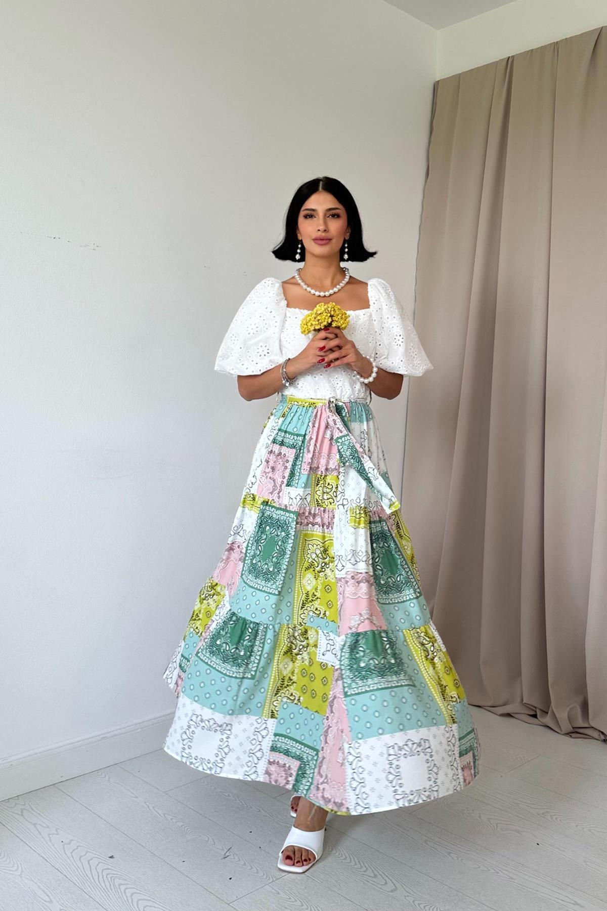 Оптовая продажа пудровая юбка узорчатое вышитое платье Оптовая продажа Синяя юбка Узорчатое вышитое платье