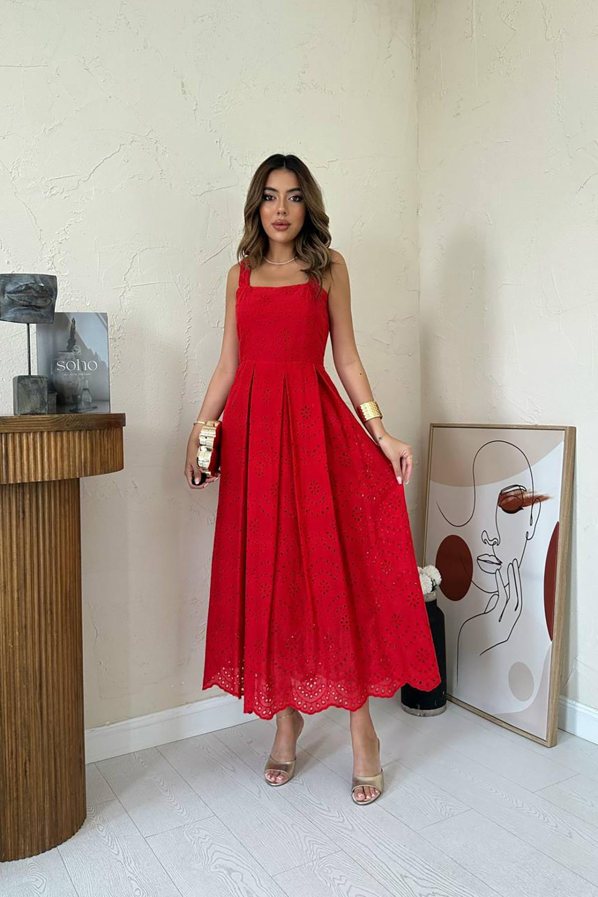 Оптовое красное платье с вышивкой на бретелях (8054)