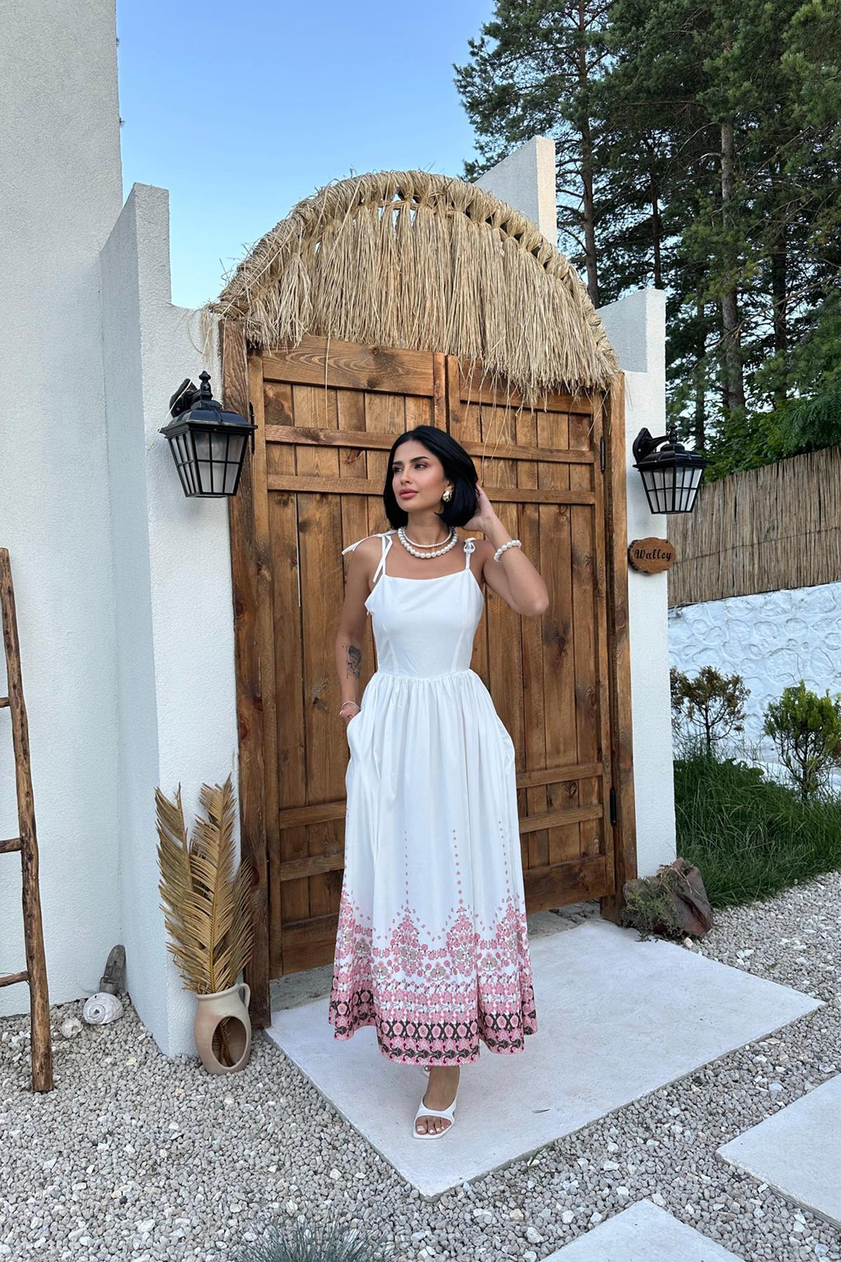 Оптовое белое платье с принтом и деталями на бретелях