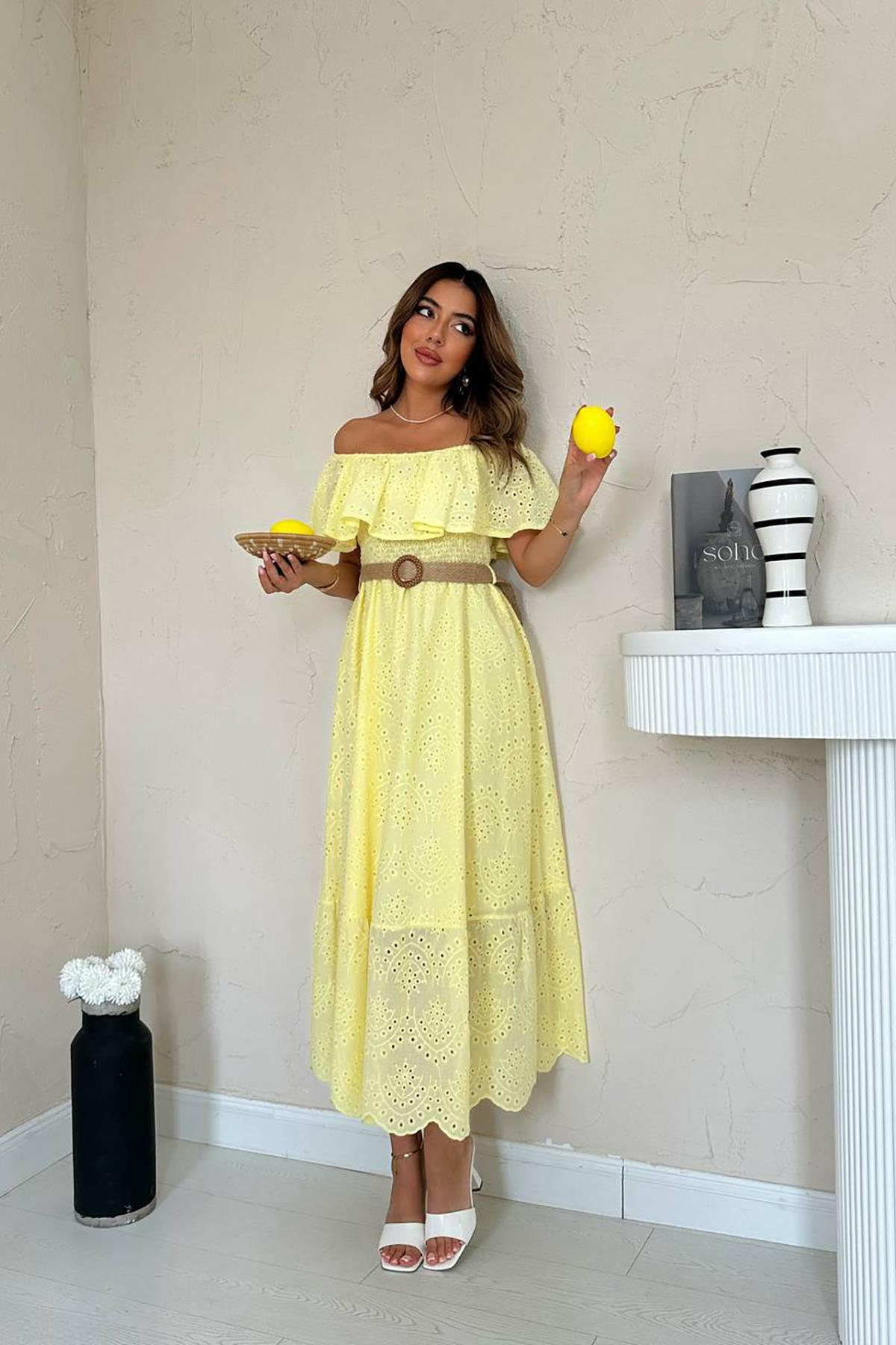 Оптовая продажа желтого эластичного плечевого вышитого платья