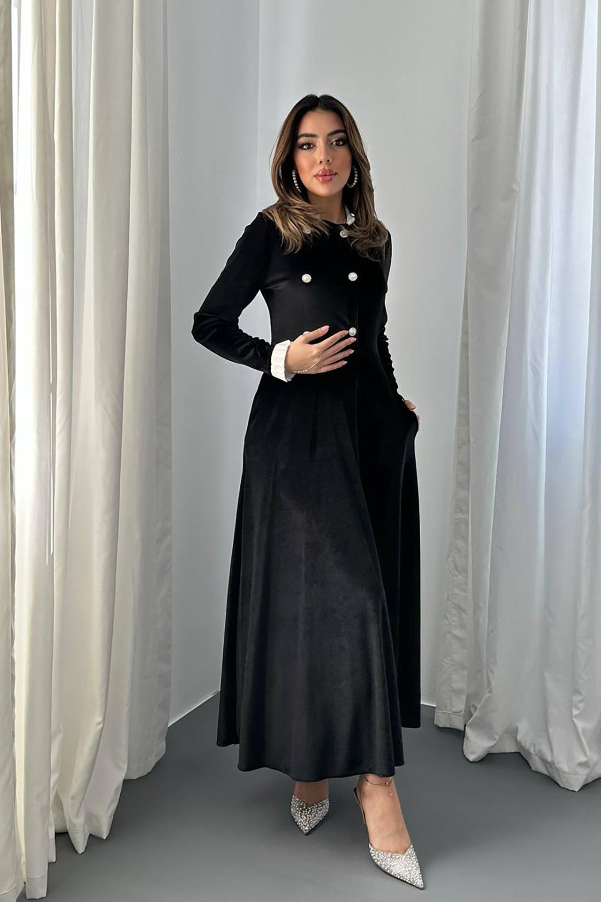 Toptan Siyah Yakası Taşlı Garnili Kadife Elbise