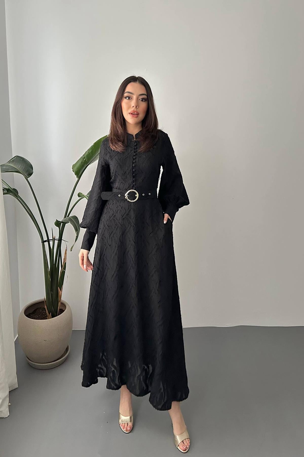 Toptan Siyah Kemer Detaylı Uzun Elbise