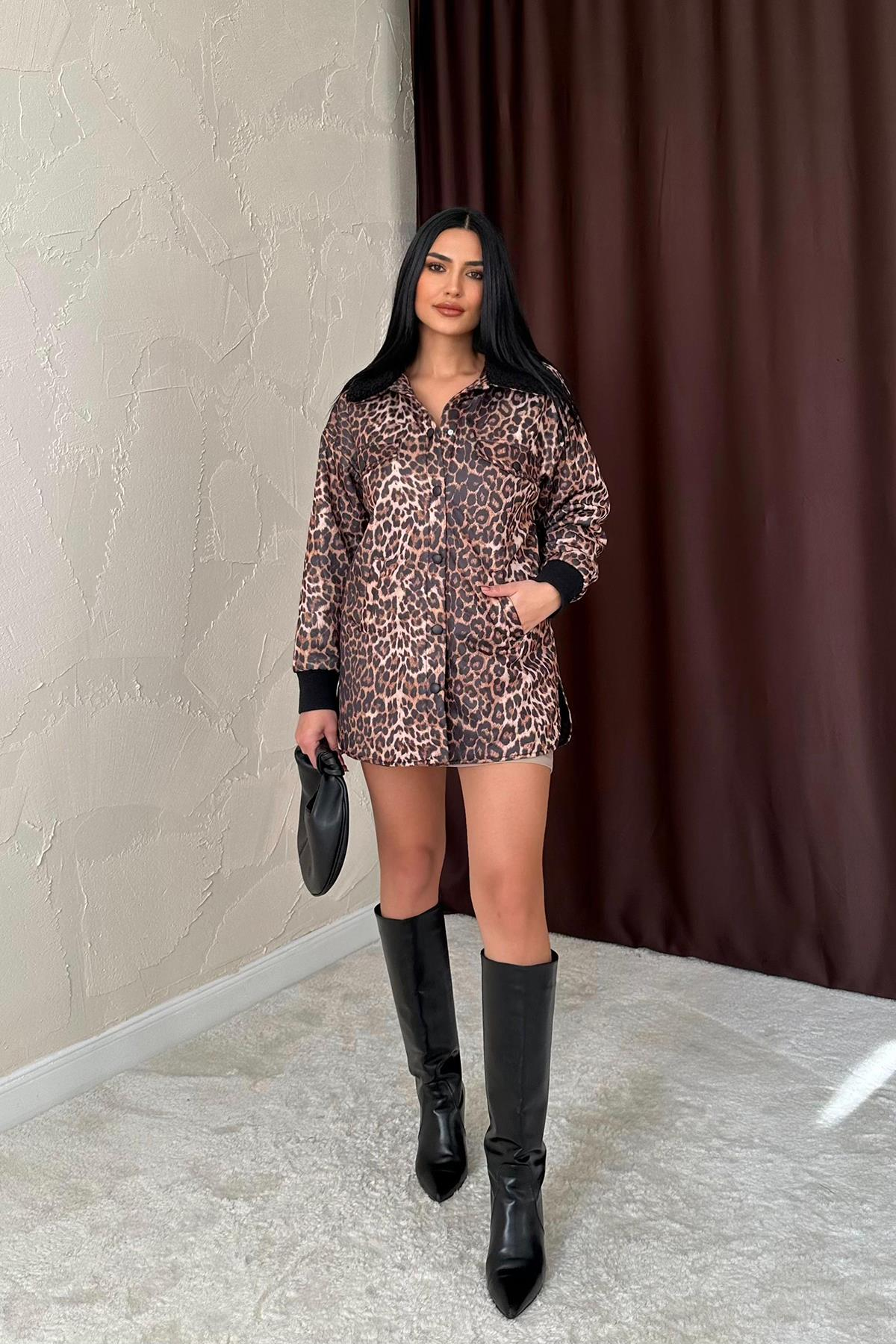 Toptan Leopar Yakası Kürk Garnili Desenli Ceket